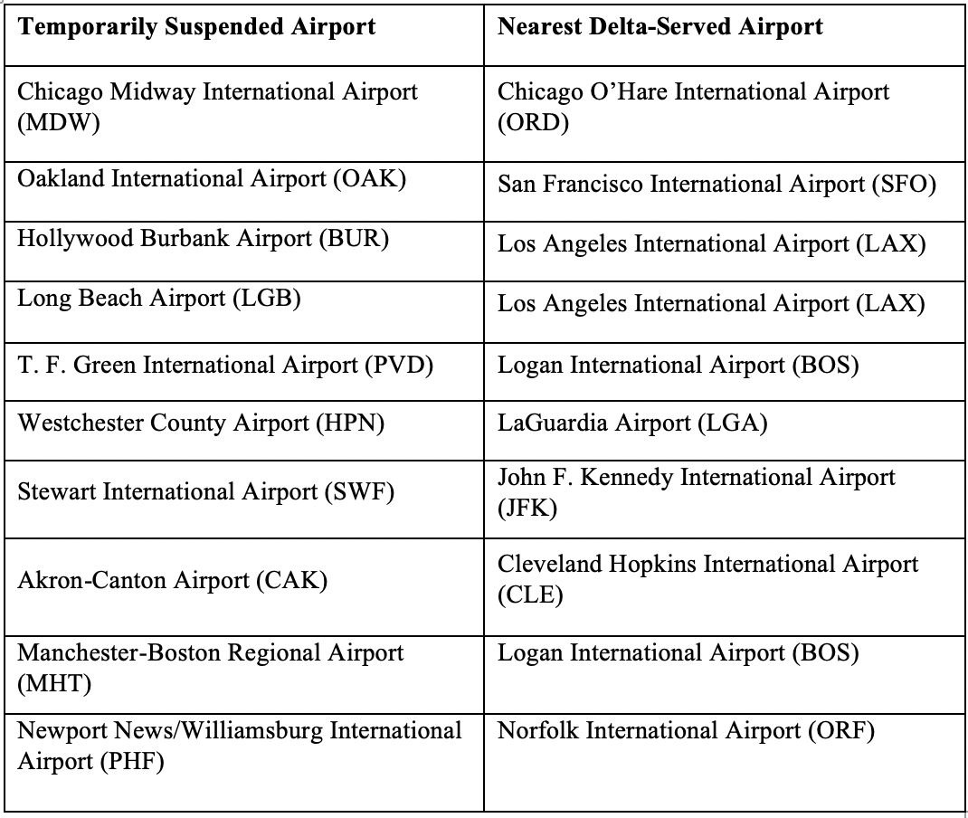 Delta will also temporarily suspend service to Saskatoon International Airport beginning May 13.