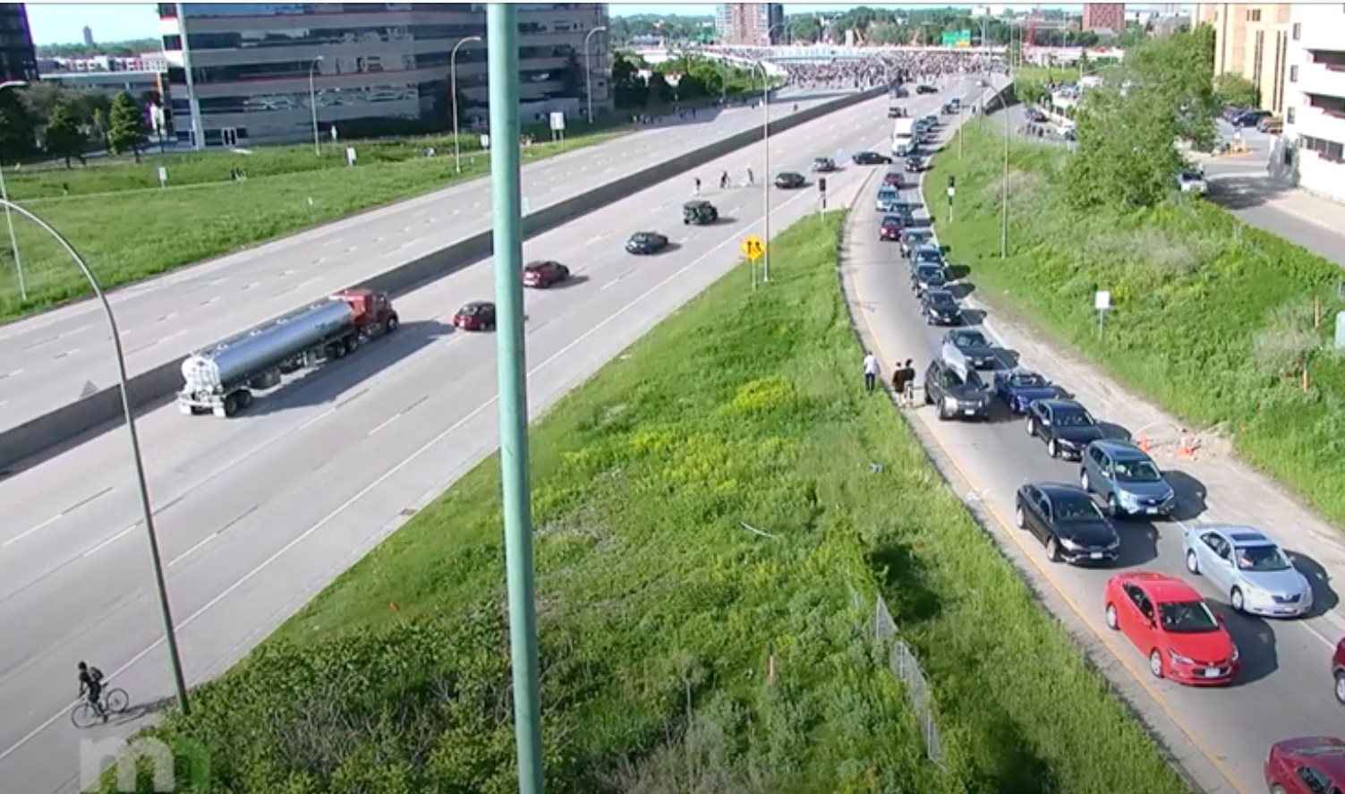 In the video, the semi-truck is seen driving to the left of traffic being diverted due to the protests. MnDOT says