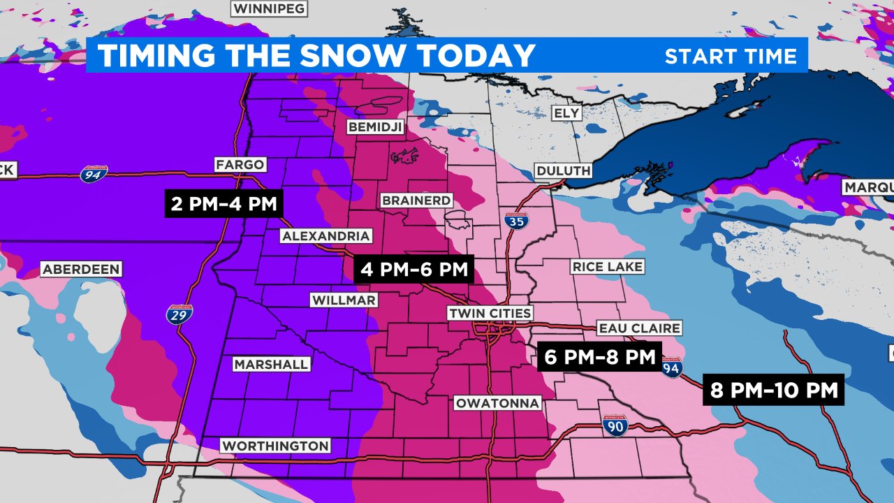 The next round of snow will move into the metro around 5 p.m. It’ll target central and southern Minnesota, but the system will be quick and move out around midnight.